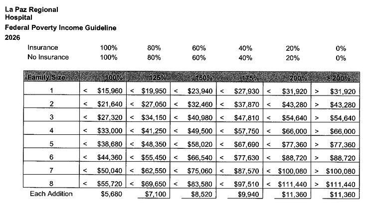 La Paz Regional Hospital and Clinics will offer a Sliding Fee Discount Program to all who are unable to pay and will not discriminate on the basis of age, gender, race, sexual orientation, creed, religion, disability, or national origin. The Federal Poverty Guidelines are used in creating and annually updating the sliding fee schedule (SFS) to determine eligibility.